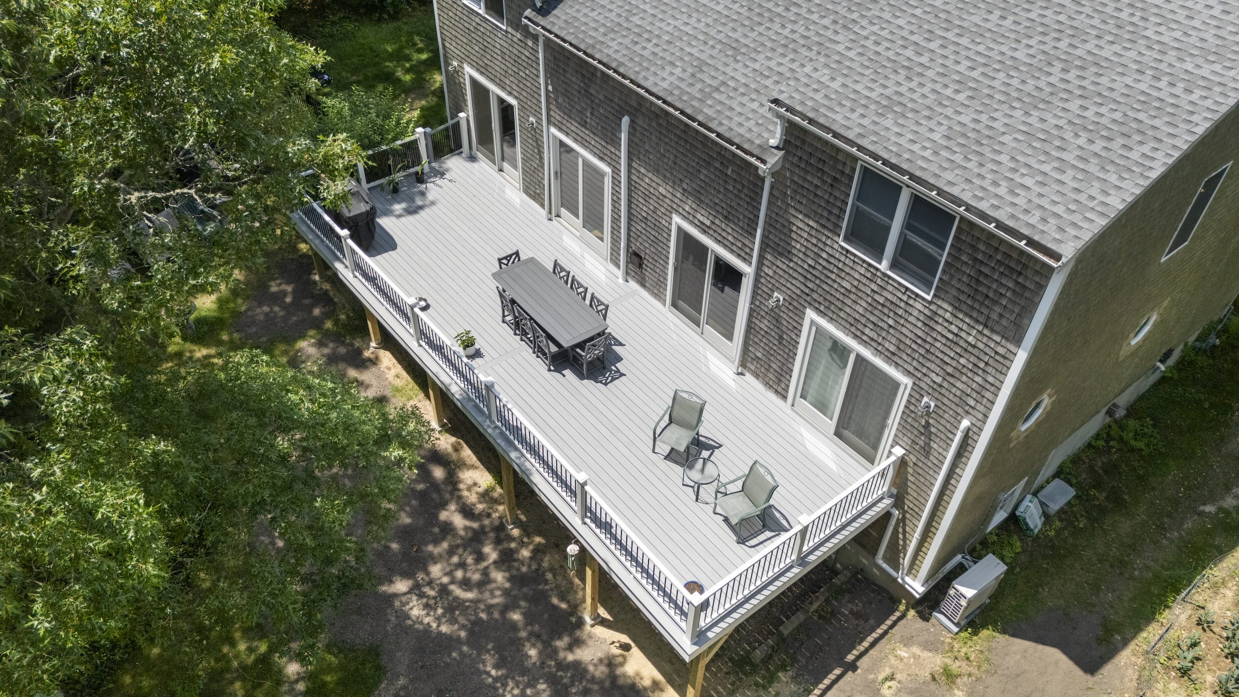 The new deck increased the depth from 10 feet to 14 feet, creating a more flexible footprint that can be fully enclosed in the future as a three-season porch. To support this long-term vision, MassTech installed six new concrete footings, including one post that reaches over 10 feet from the ground—requiring 6×6 structural posts per Massachusetts building code. In addition, the team used substantial 5-foot precast footings to ensure proper support for the upgraded structure and future enclosure. The previous deck was 41′ x 10′ and the completed deck 41′ x 14′.